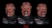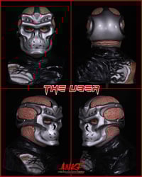 I loved the terminatorish look and knew I had to sculpt it. It was sculpted around the hock/helmet made by Darb Designz so it should fit great if you have one from him. There may be a slight gap due to latex shrinkage. These are completely foam filled and can sit perfectly without a stand.
